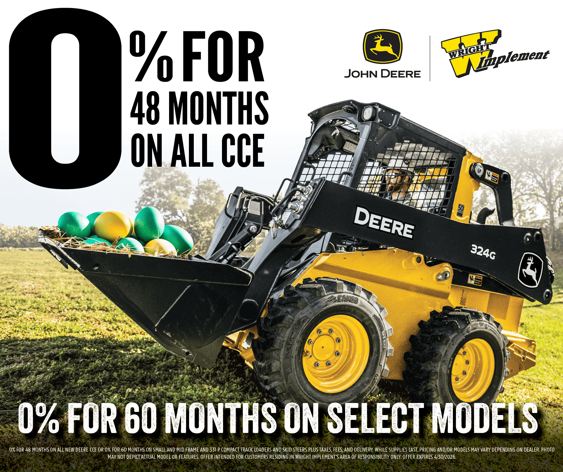 0% FOR 48 MONTHS on all new Deere CCE or 0% FOR 60 MONTHS on Small and Mid Frame and 331 P Compact Track Loaders and Skid Steers PLUS TAXES, FEES, AND DELIVERY. WHILE SUPPLIES LAST. PRICING AND/OR MODELS MAY VARY DEPENDING ON DEALER. Photo may not depict actual model or features. Offer intended for customers residing in Wright Implement’s area of responsibility ONLY. Offer expires 4/30/2026.