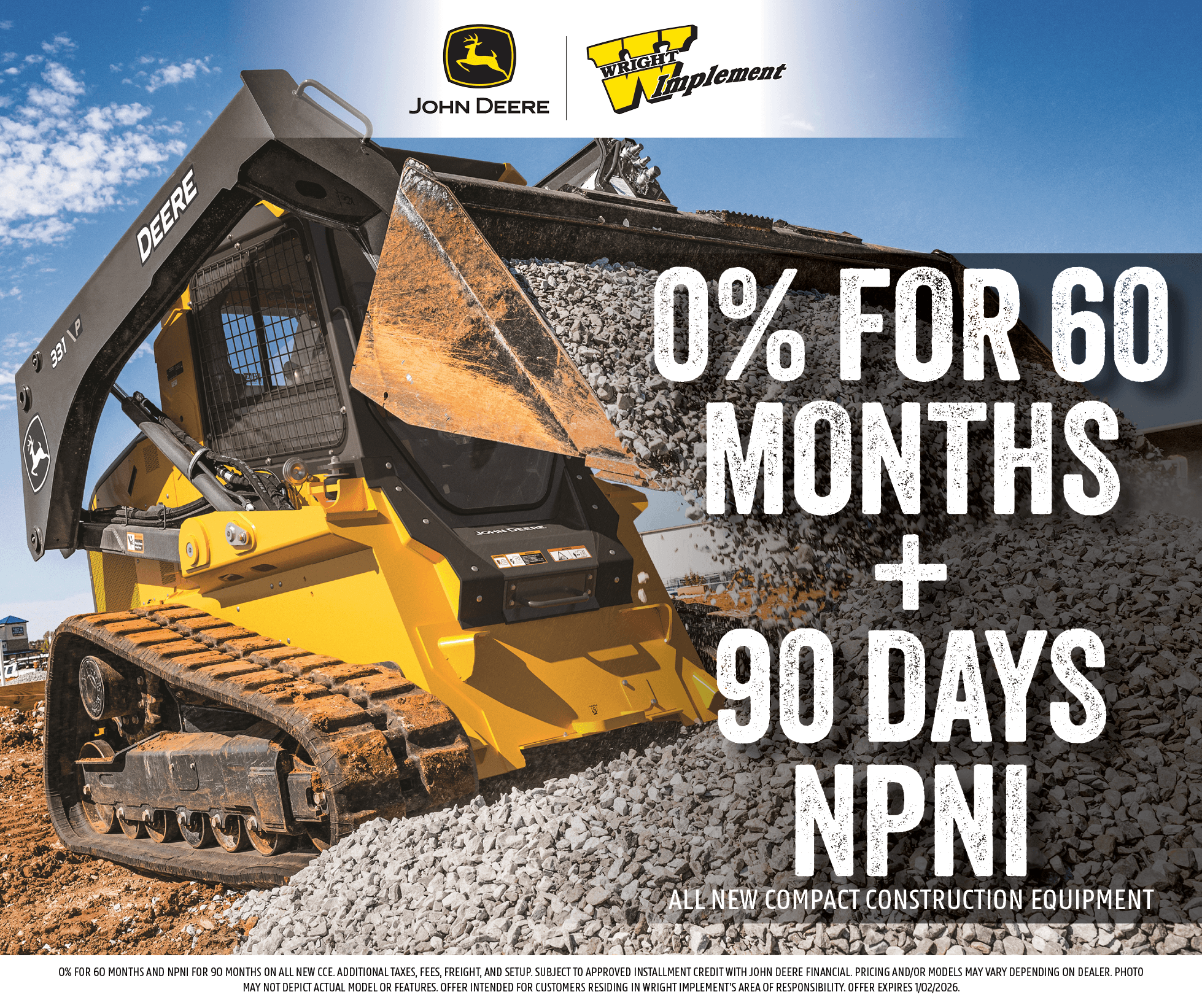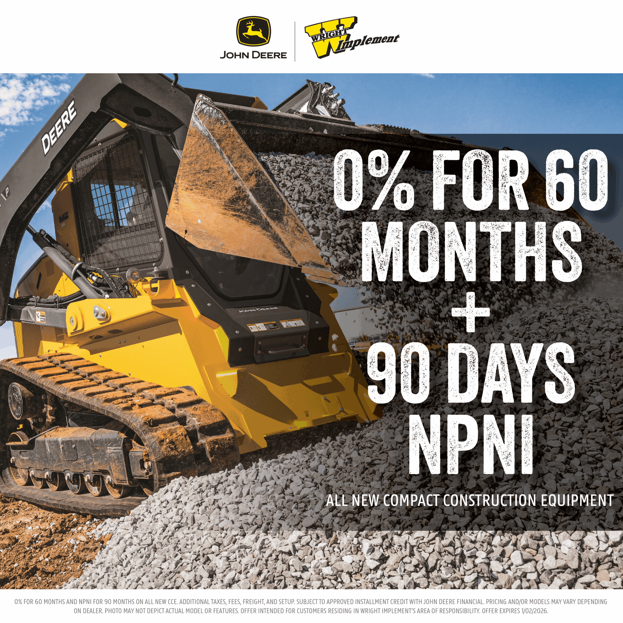 0% FOR 60 MONTHS AND NPNI FOR 90 MONTHS ON ALL NEW CCE. ADDITIONAL TAXES, FEES, FREIGHT, AND SETUP. Subject to approved installment credit with John Deere Financial. PRICING AND/OR MODELS MAY VARY DEPENDING ON DEALER. Photo may not depict actual model or features. Offer intended for customers residing in Wright Implement’s area of responsibility. Offer expires 1/02/2026.