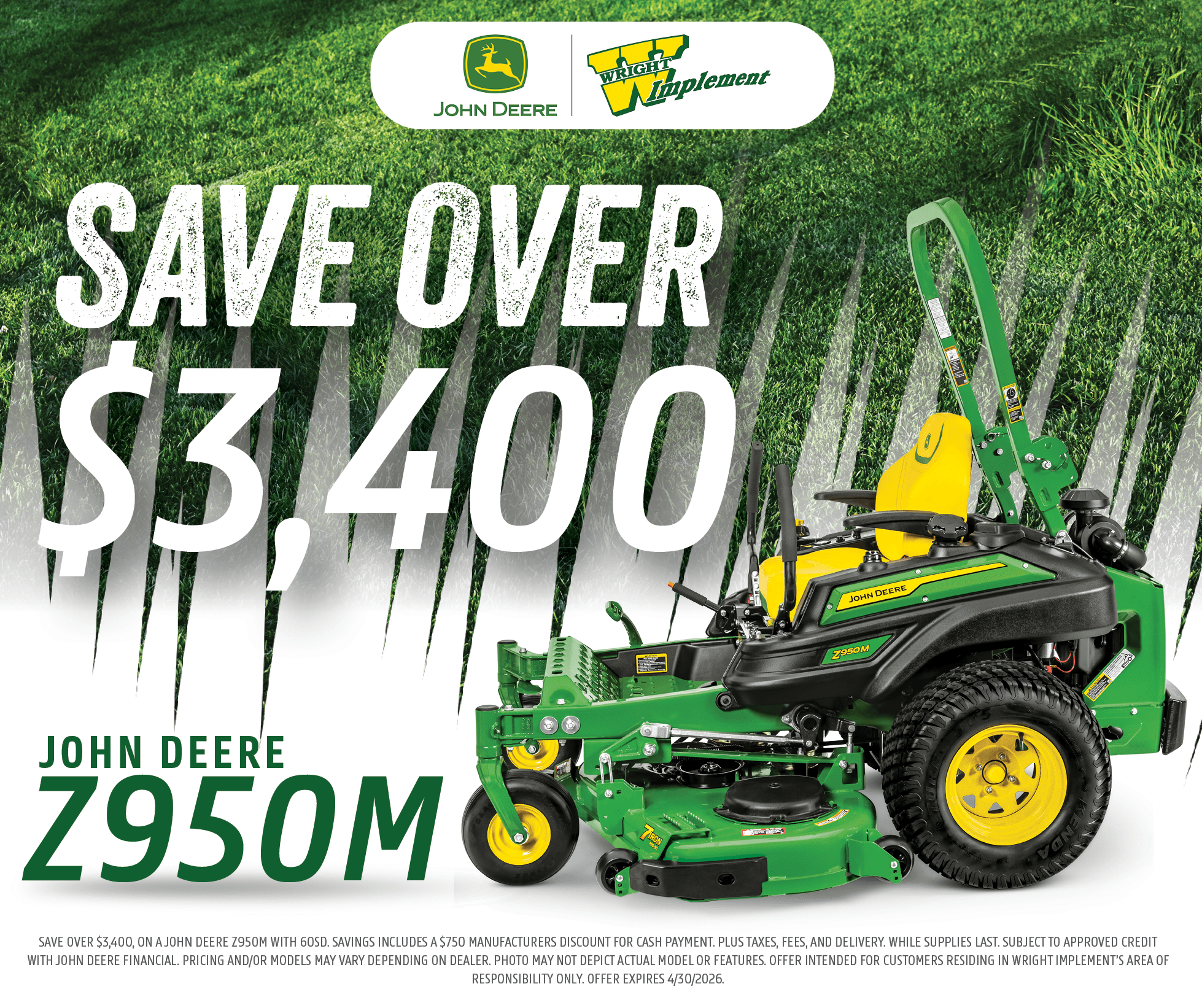 SAVE OVER $3,400, ON A JOHN DEERE Z950M WITH 60SD. Savings includes a $750 manufacturers discount for cash payment. PLUS TAXES, FEES, AND DELIVERY. WHILE SUPPLIES LAST. PRICING AND/OR MODELS MAY VARY DEPENDING ON DEALER. Photo may not depict actual model or features. Offer intended for customers residing in Wright Implement’s area of responsibility ONLY. Offer expires 4/30/2026.