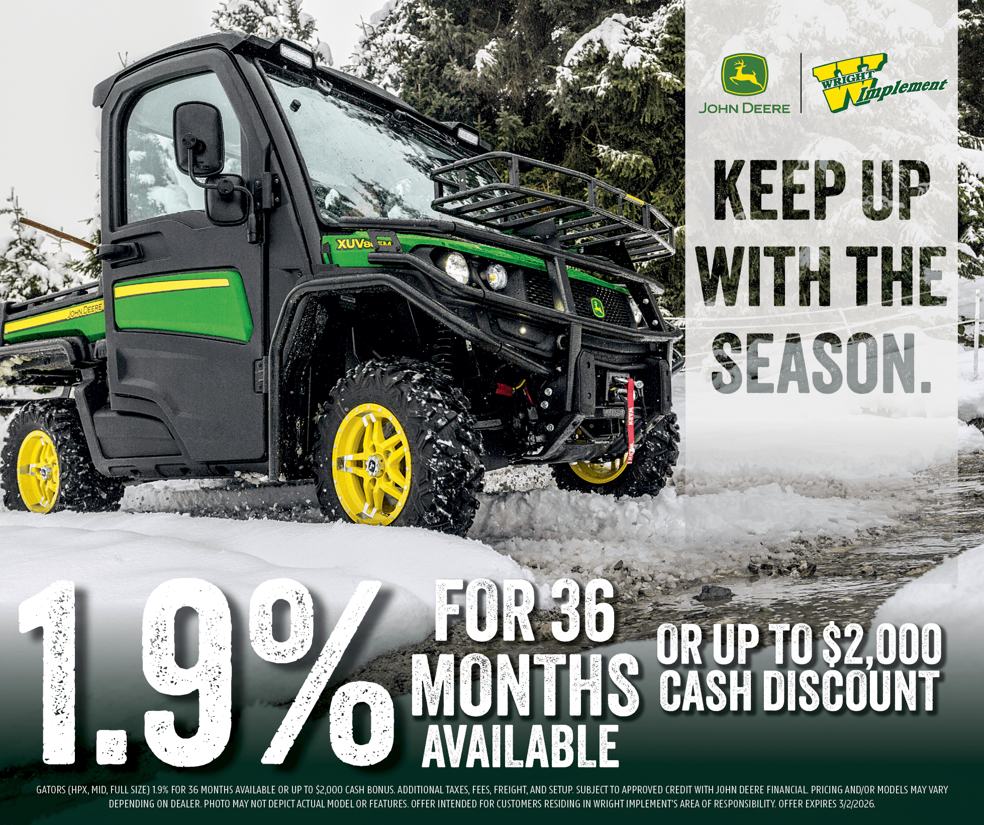 Gators (HPX, Mid, Full Size) 1.9% for 36 months available OR up to $2,000 cash bonus. ADDITIONAL TAXES, FEES, FREIGHT, AND SETUP. Subject to approved credit with John Deere Financial. PRICING AND/OR MODELS MAY VARY DEPENDING ON DEALER. Photo may not depict actual model or features. Offer intended for customers residing in Wright Implement’s area of responsibility. Offer expires 2/28/2026.