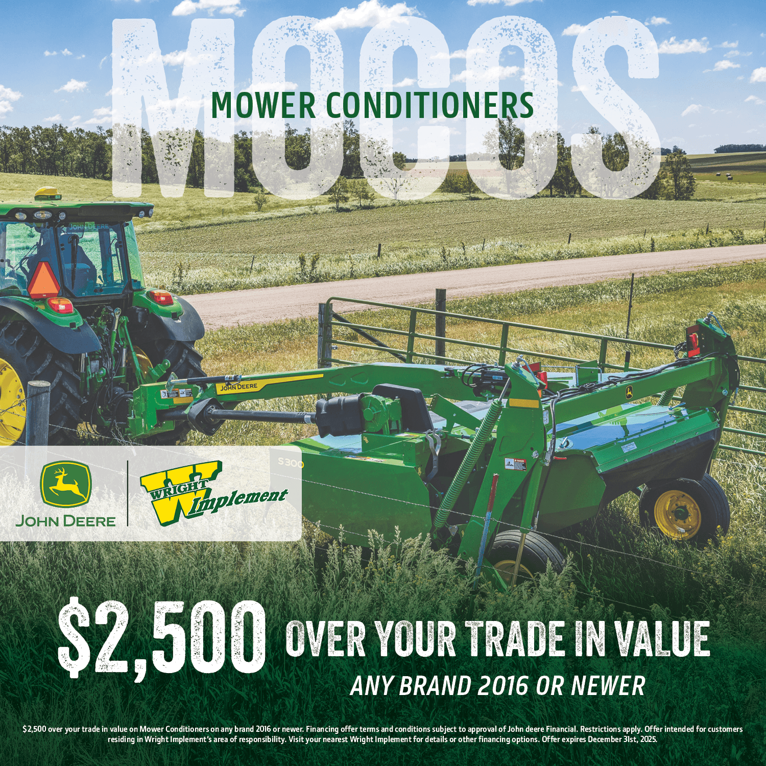 $2,500 over your trade in value on Mower Condtioners on any brand 2016 or newer. Financing offer terms and conditions subject to approval of John deere Financial. Restrictions apply. Offer intended for customers residing in Wright Implement’s area of responsibility. Visit your nearest Wright Implement for details or other financing options. Offer expires December 31st, 2025.