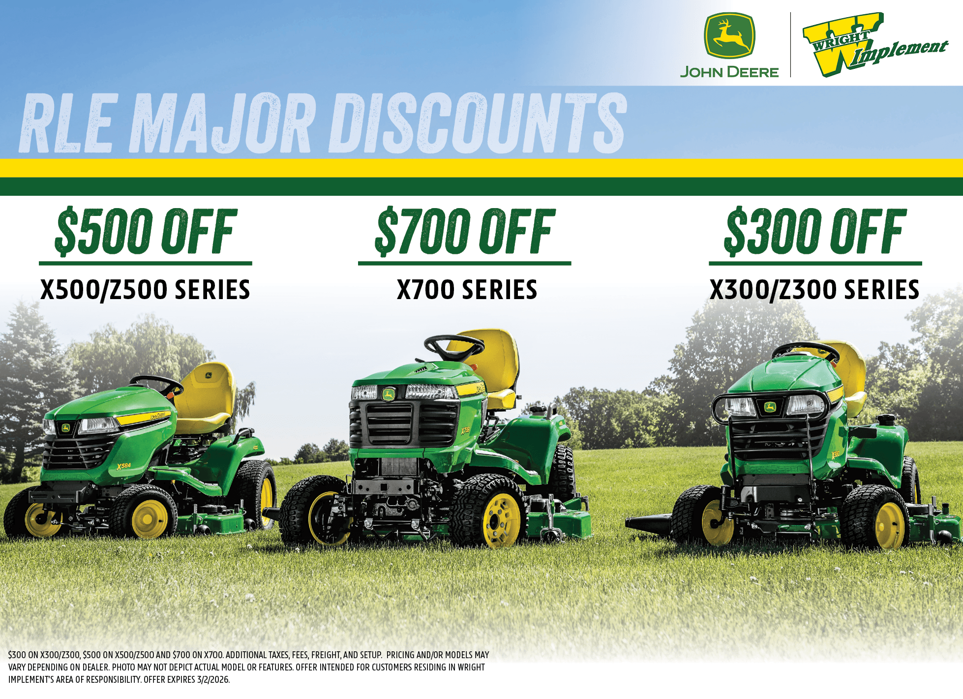$300 on X300/Z300, $500 on X500/Z500 and $700 on X700. ADDITIONAL TAXES, FEES, FREIGHT, AND SETUP. PRICING AND/OR MODELS MAY VARY DEPENDING ON DEALER. Photo may not depict actual model or features. Offer intended for customers residing in Wright Implement’s area of responsibility. Offer expires 3/2/2026.