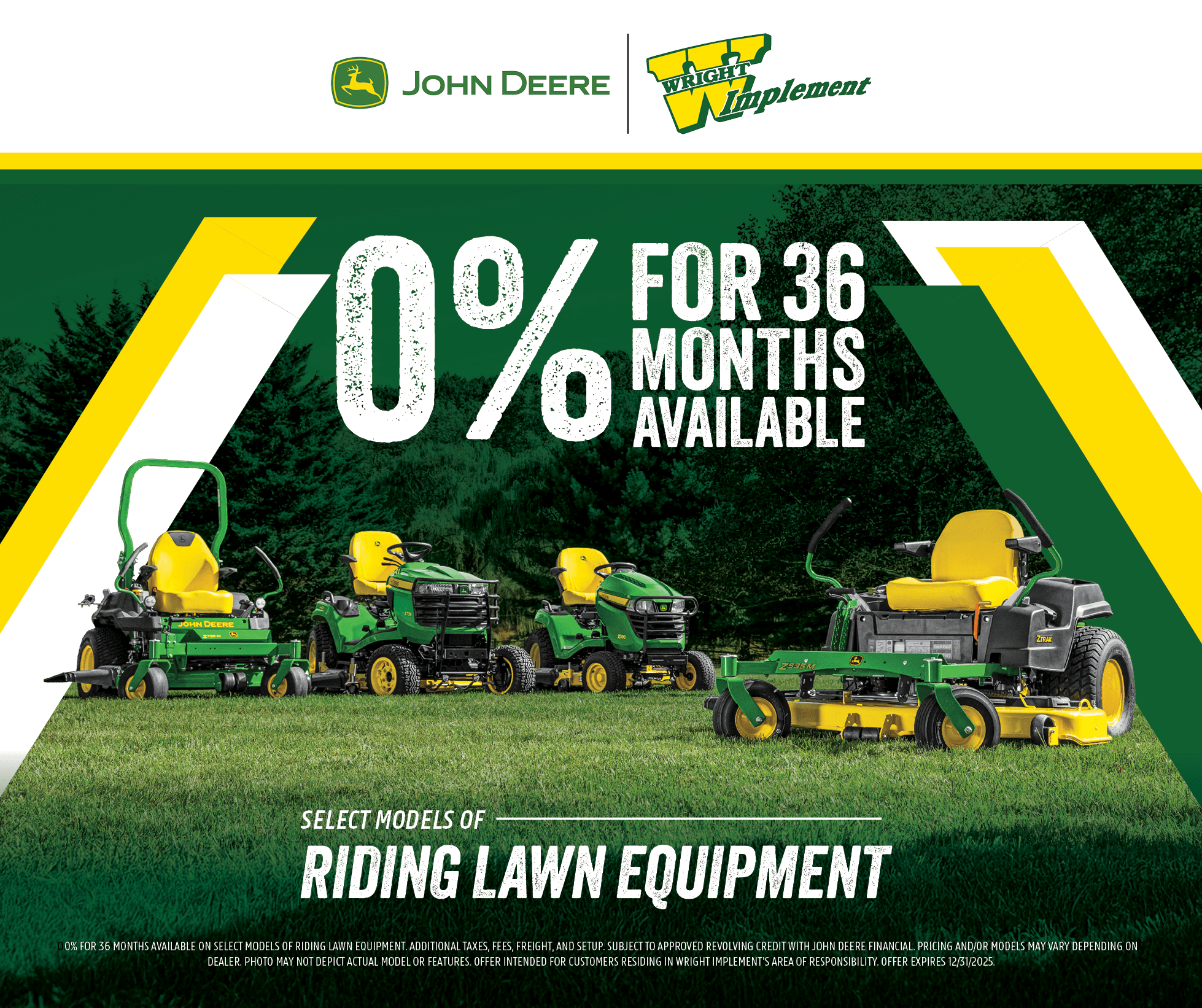 0% FOR 36 MONTHS AVAILABLE ON SELECT MODELS OF RIDING LAWN EQUIPMENT. ADDITIONAL TAXES, FEES, FREIGHT, AND SETUP. Subject to approved revolving credit with John Deere Financial. PRICING AND/OR MODELS MAY VARY DEPENDING ON DEALER. Photo may not depict actual model or features. Offer intended for customers residing in Wright Implement’s area of responsibility. Offer expires 12/31/2025.