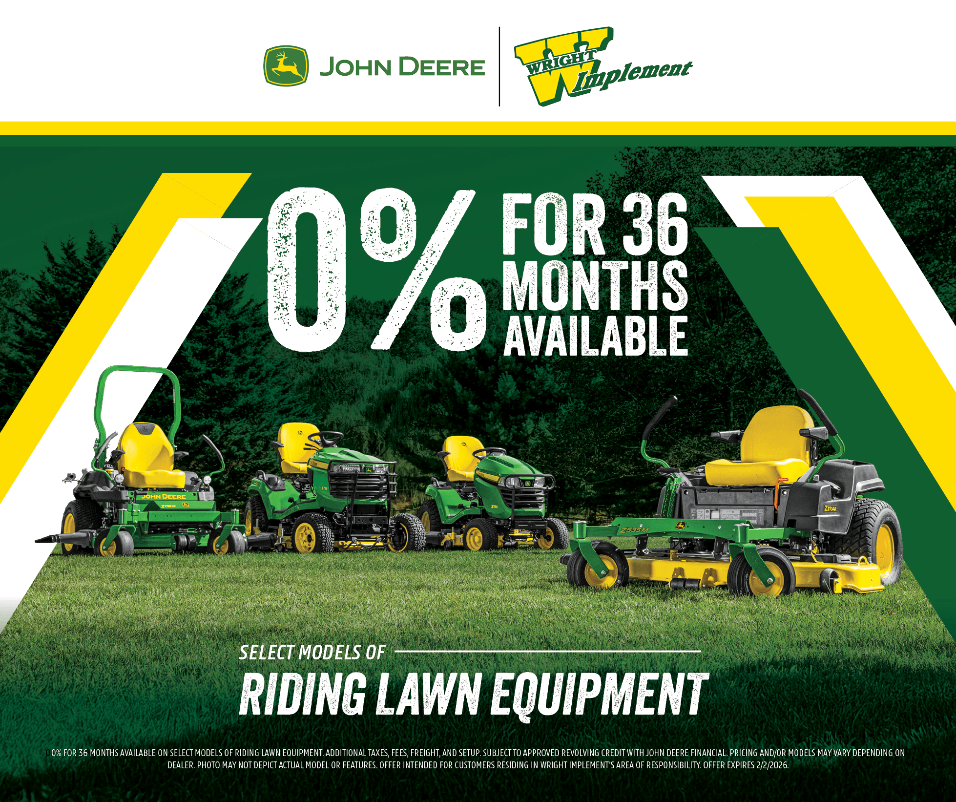 0% FOR 36 MONTHS AVAILABLE ON SELECT MODELS OF RIDING LAWN EQUIPMENT. ADDITIONAL TAXES, FEES, FREIGHT, AND SETUP. Subject to approved revolving credit with John Deere Financial. PRICING AND/OR MODELS MAY VARY DEPENDING ON DEALER. Photo may not depict actual model or features. Offer intended for customers residing in Wright Implement’s area of responsibility. Offer expires 2/2/2026.