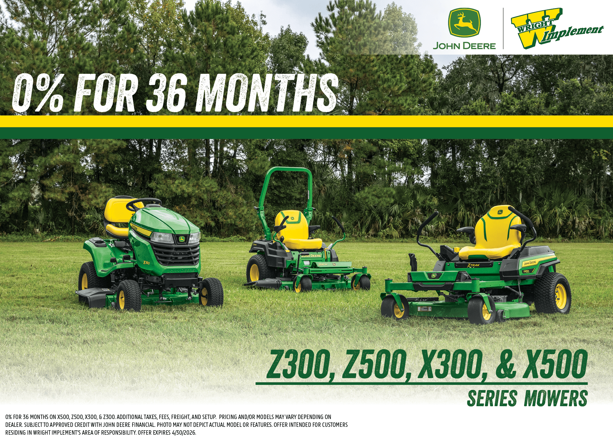 0% FOR 36 MONTHS ON X500, Z500, X300, & Z300. ADDITIONAL TAXES, FEES, FREIGHT, AND SETUP. PRICING AND/OR MODELS MAY VARY DEPENDING ON DEALER. subject to approved credit with John Deere Financial. Photo may not depict actual model or features. Offer intended for customers residing in Wright Implement’s area of responsibility. Offer expires 4/30/2026.