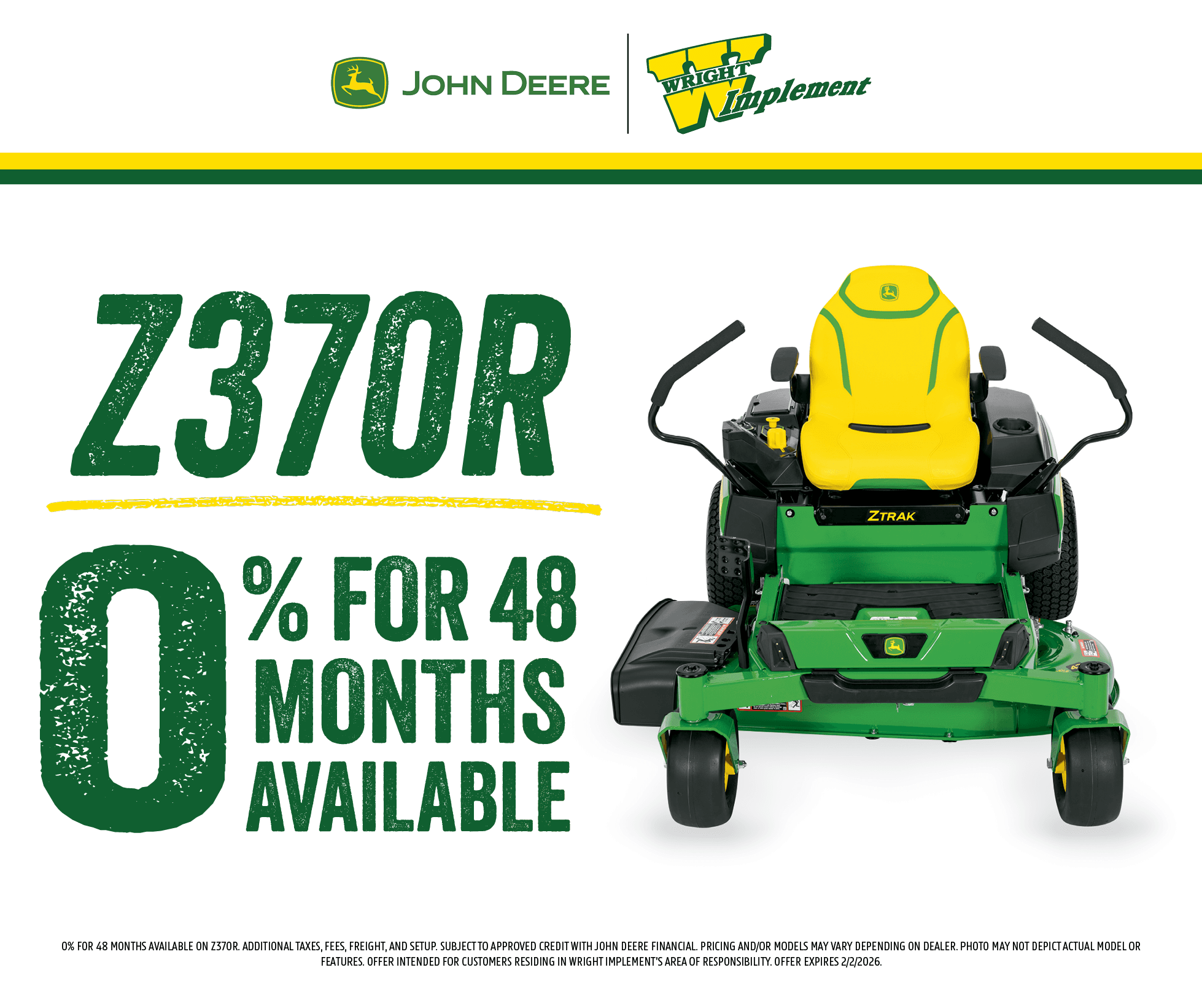 0% FOR 48 MONTHS AVAILABLE ON Z370R. ADDITIONAL TAXES, FEES, FREIGHT, AND SETUP. Subject to approved credit with John Deere Financial. PRICING AND/OR MODELS MAY VARY DEPENDING ON DEALER. Photo may not depict actual model or features. Offer intended for customers residing in Wright Implement’s area of responsibility. Offer expires 2/2/2026.