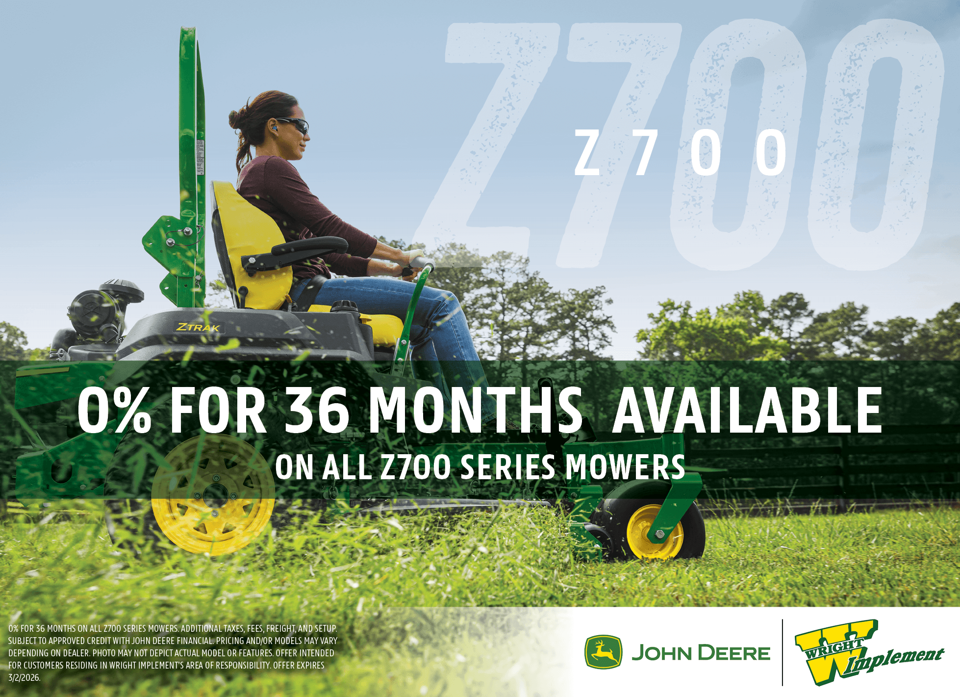 0% FOR 36 MONTHS on all z700 series mowers. ADDITIONAL TAXES, FEES, FREIGHT, AND SETUP. Subject to approved credit with John Deere Financial. PRICING AND/OR MODELS MAY VARY DEPENDING ON DEALER. Photo may not depict actual model or features. Offer intended for customers residing in Wright Implement’s area of responsibility. Offer expires 3/2/2026.
