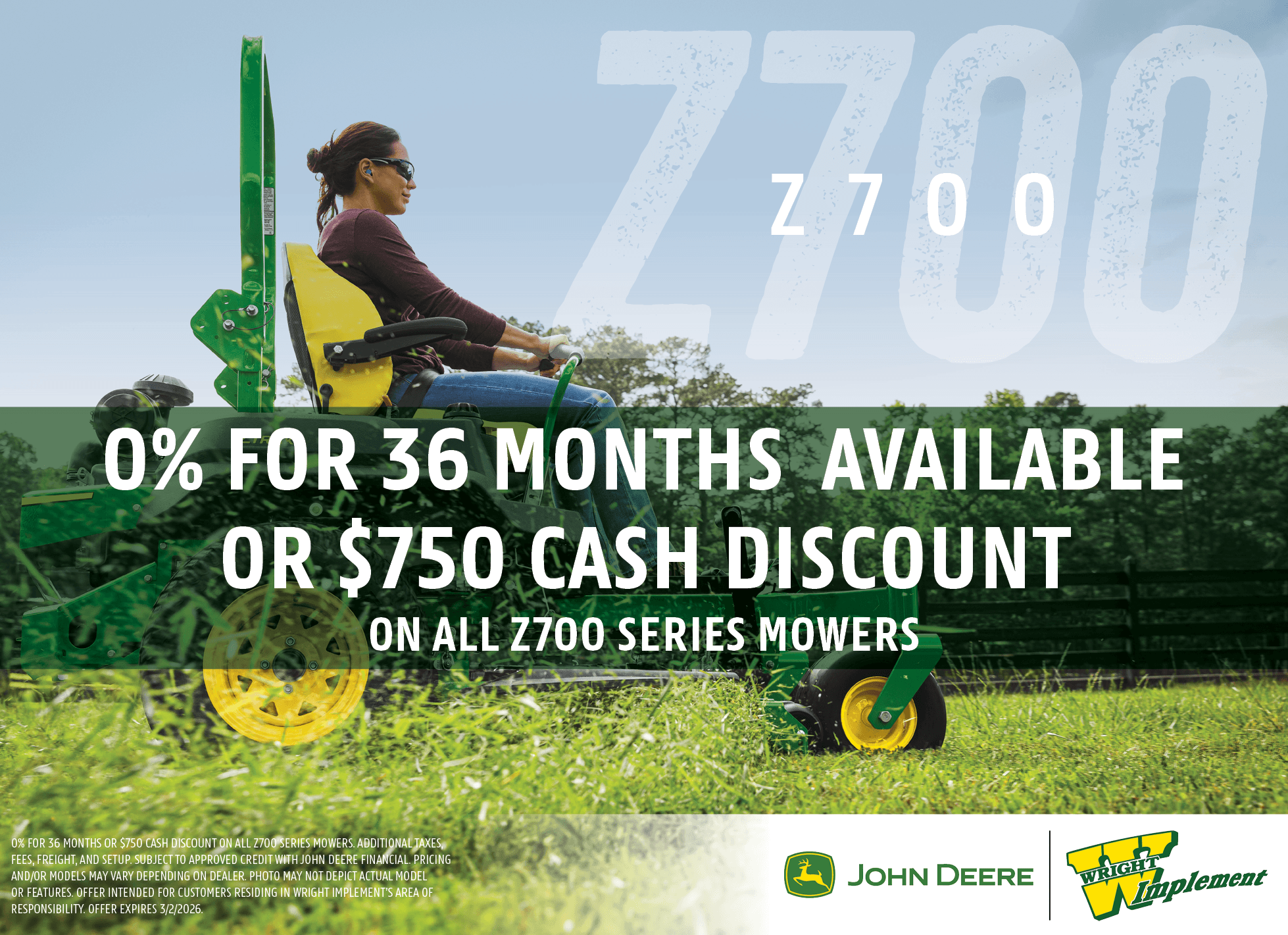 0% FOR 36 MONTHS OR $750 CASH DISCOUNT on all z700 series mowers. ADDITIONAL TAXES, FEES, FREIGHT, AND SETUP. Subject to approved credit with John Deere Financial. PRICING AND/OR MODELS MAY VARY DEPENDING ON DEALER. Photo may not depict actual model or features. Offer intended for customers residing in Wright Implement’s area of responsibility. Offer expires 3/2/2026.